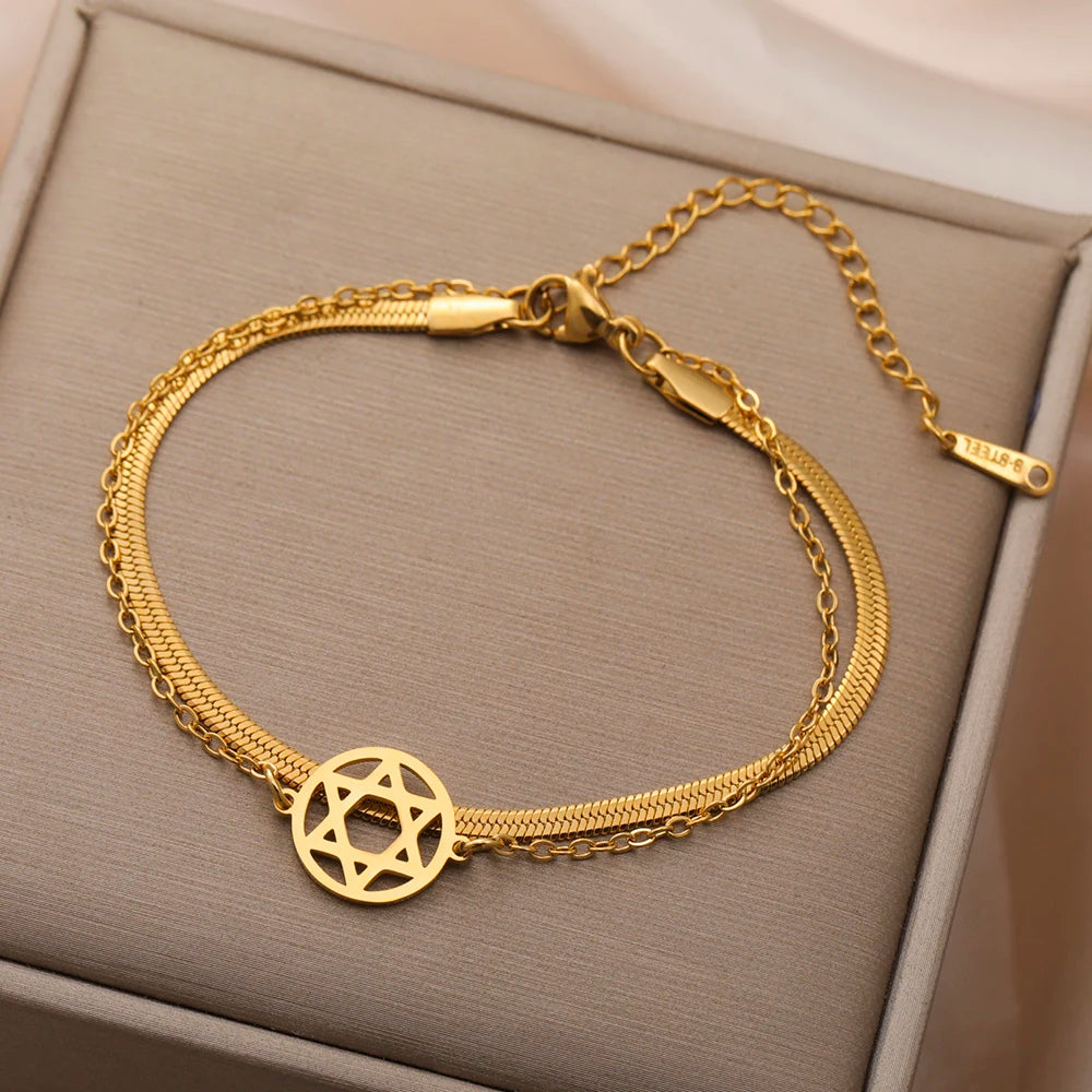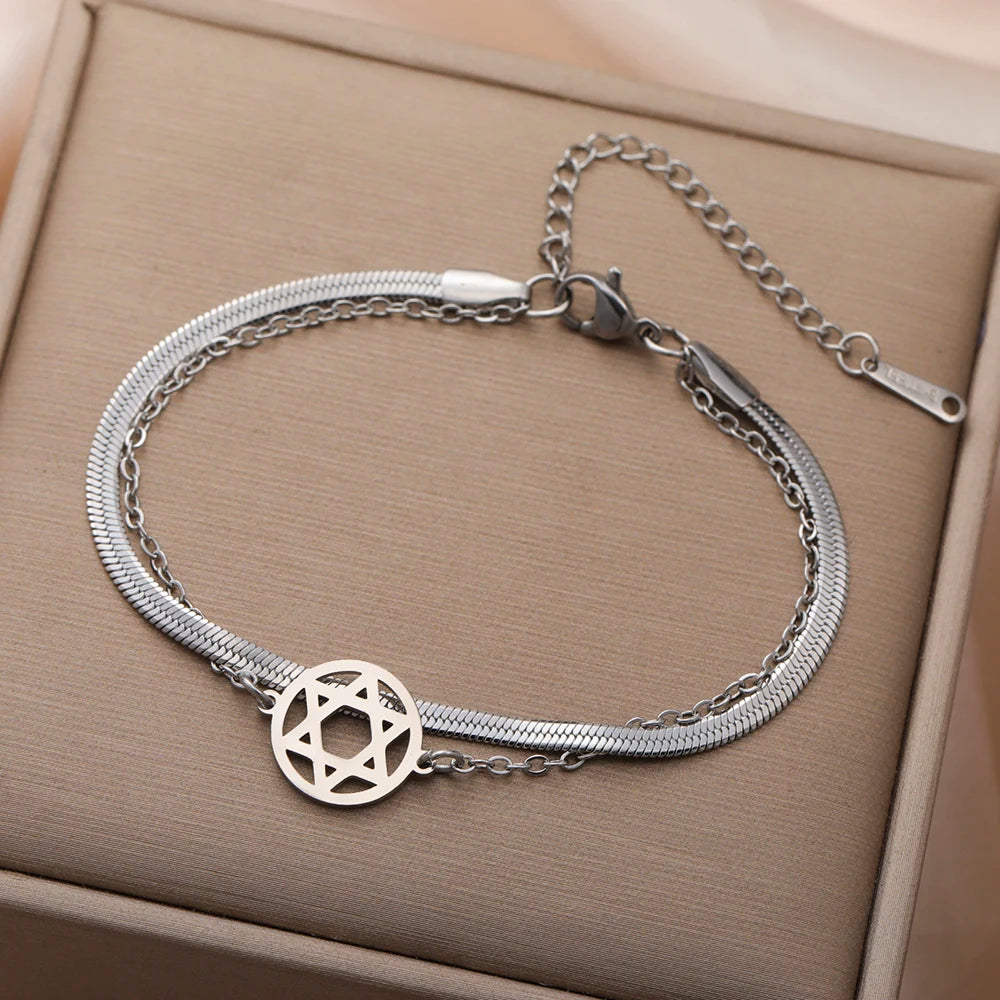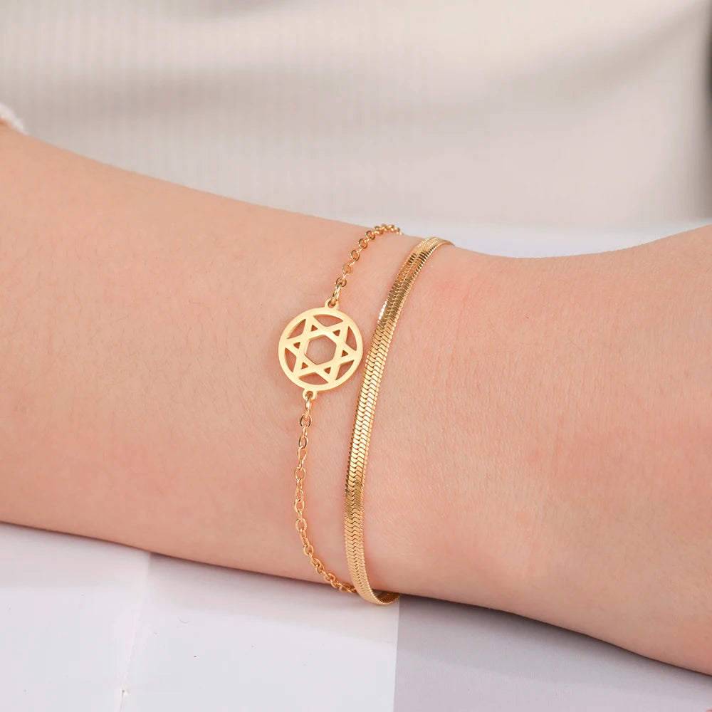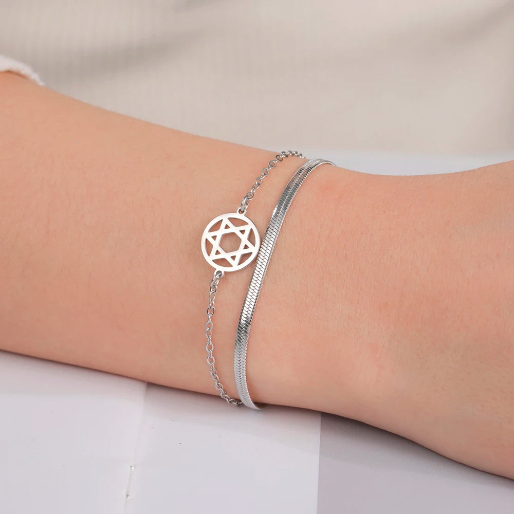 צמיד אלגנטי עם תליון מגן דוד בעיצוב נקי ומאוזן, המשתלב בקלות עם כל סגנון לבוש. הצמיד מתאים גם לנשים וגם לגברים, ונראה מצוין כפריט בפני עצמו או בשילוב עם צמידים נוספים.